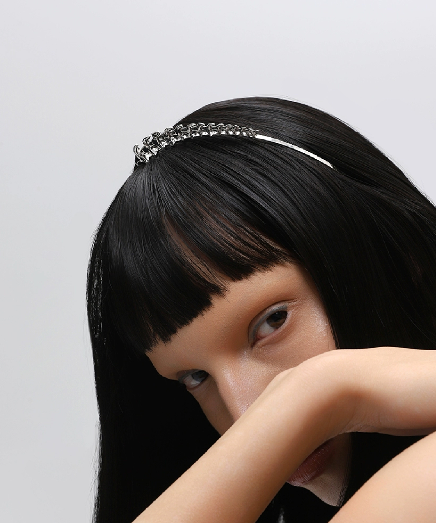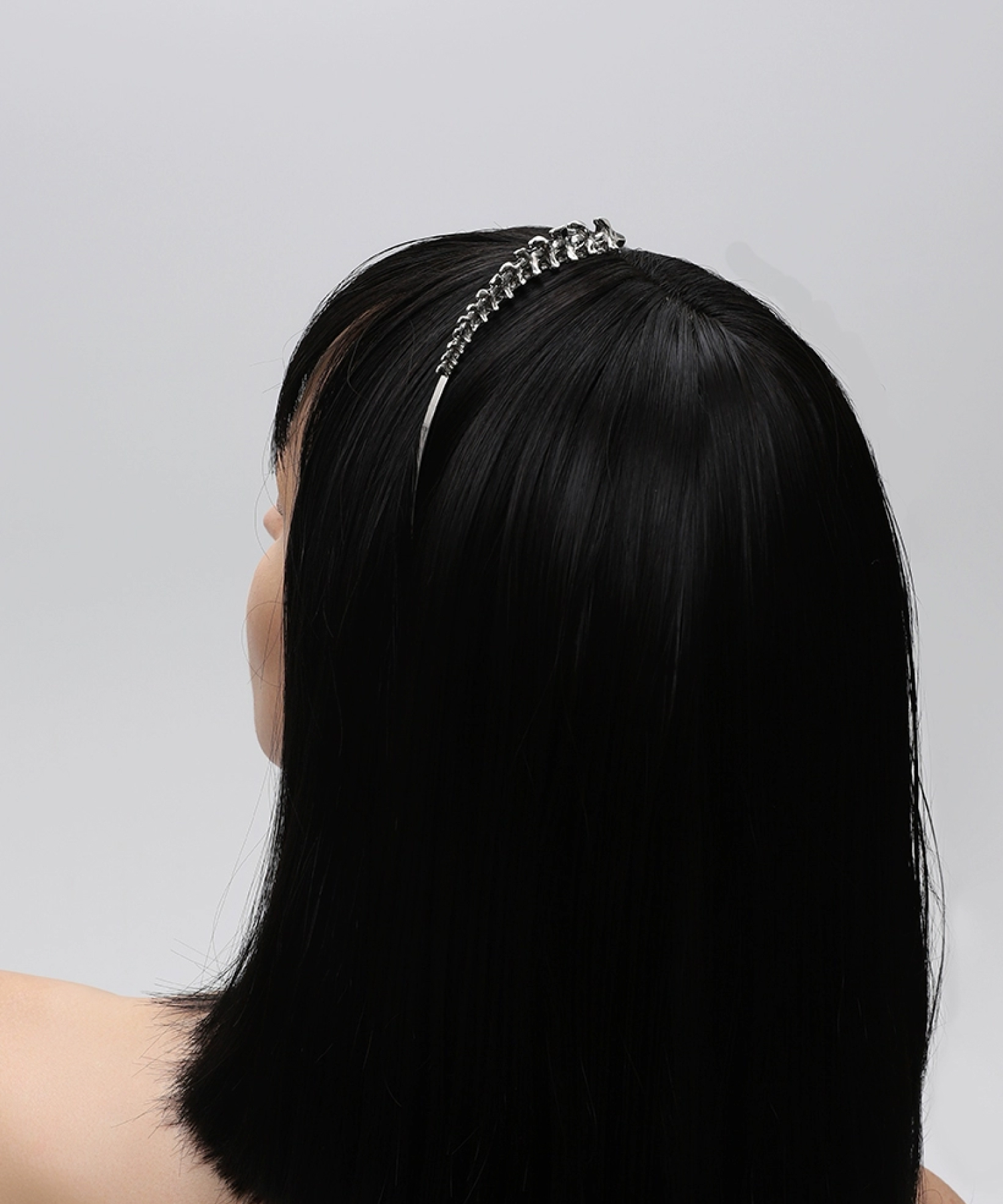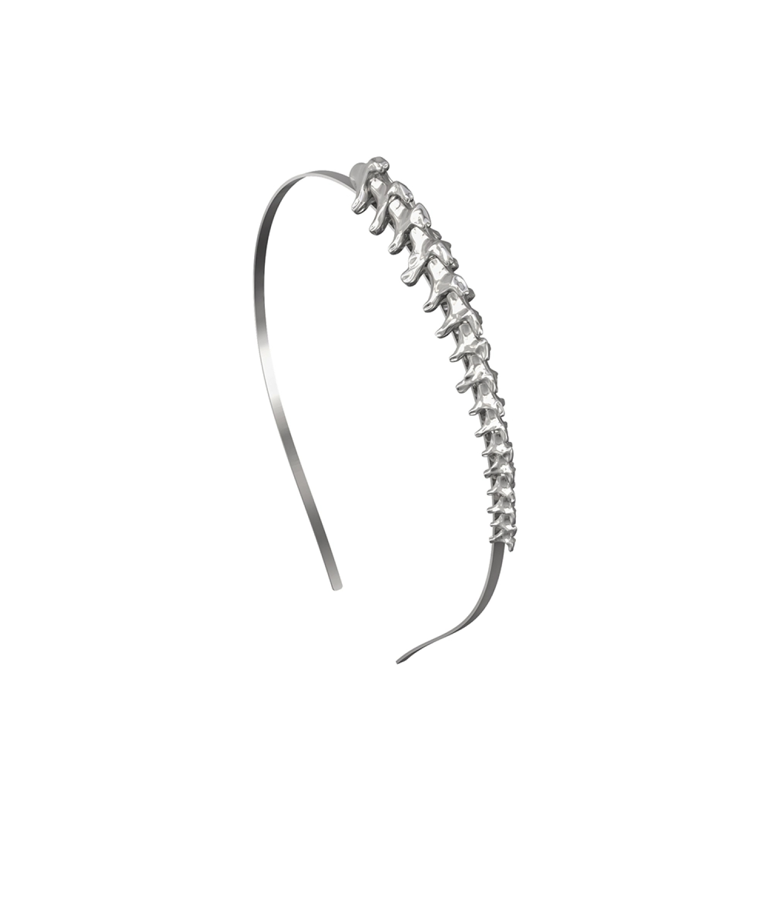 Ободок с жесткой посадкой и декоративным элементом в виде позвоночника. Минималистичная форма превращается в скульптурный акцент, который считывается как арт-объект. Для тех, кто выбирает детали с характером, а не просто аксессуары.